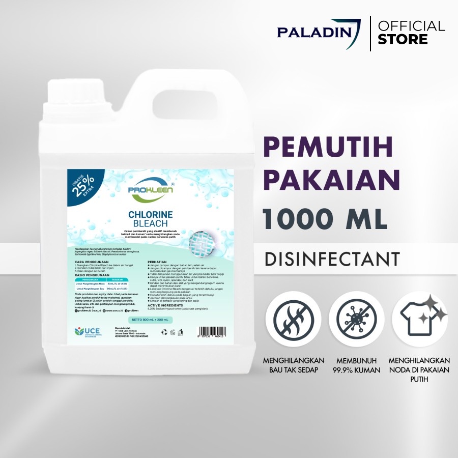 Namun, disarankan untuk menggunakan produk ini hanya pada pakaian berwarna putih karena kandungan klorin yang kuat. Selain sebagai pemutih pakaian, Prokleen Chlorine Bleach juga berfungsi sebagai disinfektan yang efektif dalam membunuh kuman. Anda dapat menggunakannya untuk membersihkan lumut atau kerak di lantai dapur dan kamar mandi, menjadikan rumah Anda bersih dan bebas dari kuman.